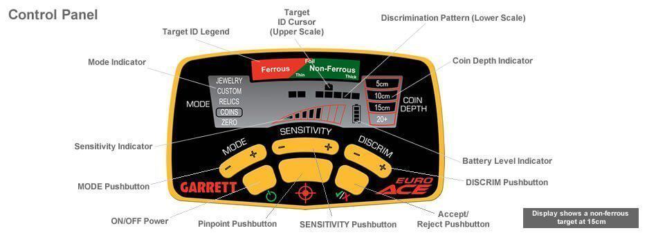بهبود های صوتی * -Tone ID بهینه سازی شده برای نشان تمایز بین اهداف آهنی و غیر آهنی. فرکانس بالاتر * -Offers توانایی تشخیص اهداف کوچک رسانا (سکه چکش، قطعات) هدفون ClearSound آسان استو حجم کنترل هدفون گرت با EuroAce شامل بهبود یافته است. تعیین الکترونیکی به بهبود هدف سرعت قبول / رد تبعیض به تغییر الگوهای تبعیض پنج حالت جستجو: الگوی از پیش تنظیم تبعیض را انتخاب کنید یا خود را ایجاد شاخص مداوم عمق سکه خود را برای تعیین عمق هدف باتری وضعیت نشانگر نشان می دهد عمر باتری به طور مستمر قابل تعویض کویل جستجو سری ACE در دسترس هستند کنترل فشاری با عملیات تک لمسی * در مقایسه با ACE 250 و ۱۵۰ ACE